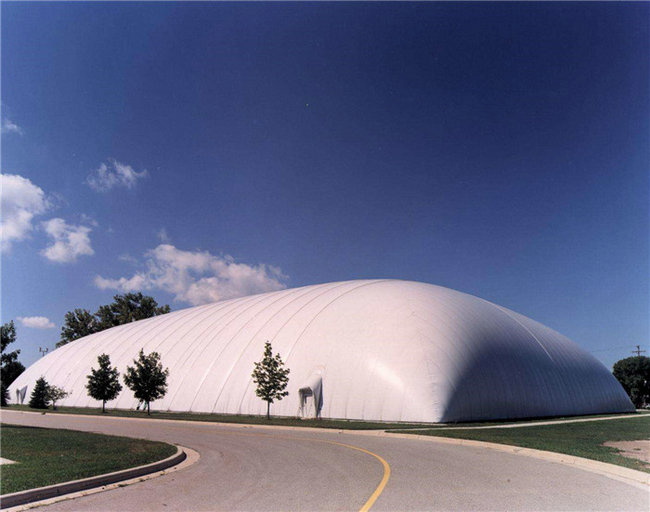 充氣膜結構是指在以高分子材料制成的薄膜制品中充入空氣后而形成房屋的結構。在形式上充氣膜結構與傳統(tǒng)建筑大有不同,又可分為氣承式膜結構和氣脹式膜結構(或叫氣肋式膜結構)。充氣膜結構有單層、雙層、氣肋式三種形式,充氣膜結構一般需要長期不間斷地能源供應。低拱、大跨建筑中的單層充氣膜結構必須是封閉的空間,并保特一定的室內(nèi)外氣壓差。